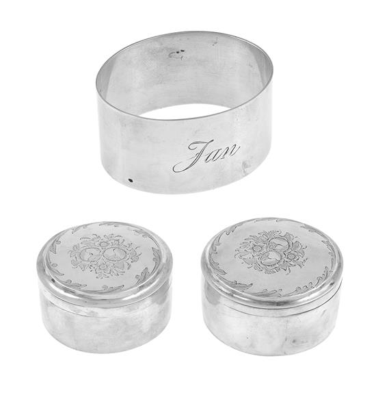 A SWEDISH SILVER NAPKIN RING AND TWO VANITY JARS