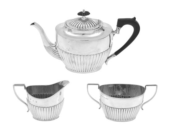 comprising a tea-pot with an ebonised handle and finial, milk jug and sugar bowl, each of an elliptical shape and with gadrooned sides to each lower half, total weight 788grs, tea-pot height 18cm