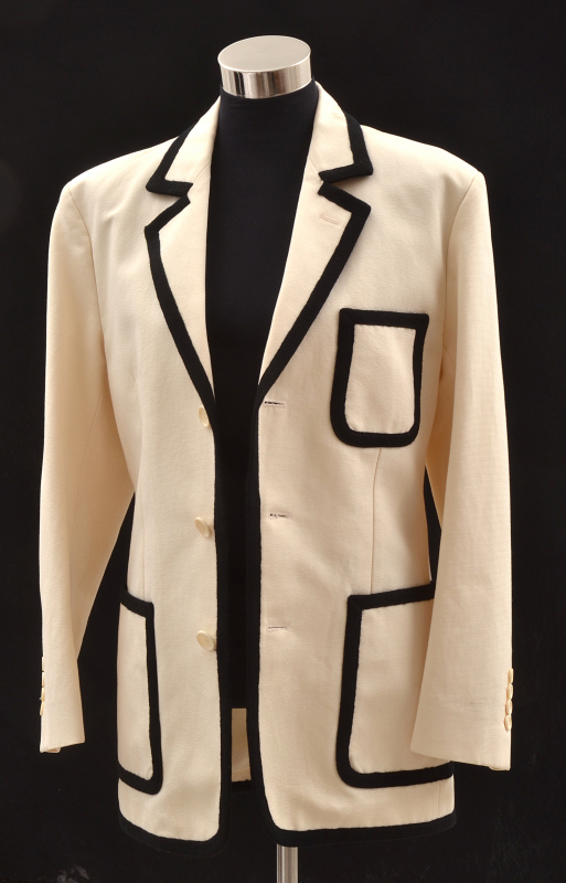 Styled in cream cotton and silk with black border detail, labelled 48.