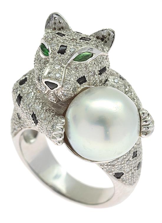 Modelled as a leopard holding a pearl of silver white hue measuring 11.45mm, pave set with diamonds and onyx, and having emerald set eyes, mounted in18ct white gold, ring size M.