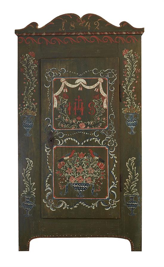 A 19TH CENTURY SWISS PAINTED PINE HALL CUPBOARD, DATED 1842