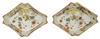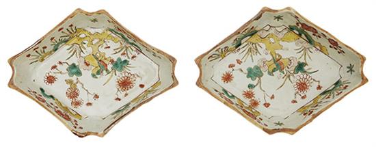 Of rhombic shape with famille rose decoration, depicting birds and flowers, previously used as appetizer plates, 22cm diameter.