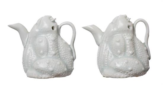 Styled in a white glaze, with long spout and short handle, decorated with frogs, fish scales and pearls, Hutian kiln, 7cm high.
