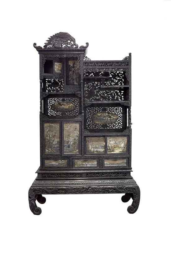 Carved in relief with birds, blossom branches and openwork panels, of asymmetric design surmounted by dragon moulded cornice, the panel doors embellished with lacquer and hand painted typical scenes, each one signed, on an integral stand, 124cm width x 30cm depth x 205cm height.