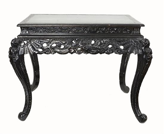 The cabriole leg carved in high relief with zoomorphic mouldings, the openwork apron with dragon, the top with Greek key carved edge, painted in black lacquer, 102cm width x 690cm depth x 78cm height.