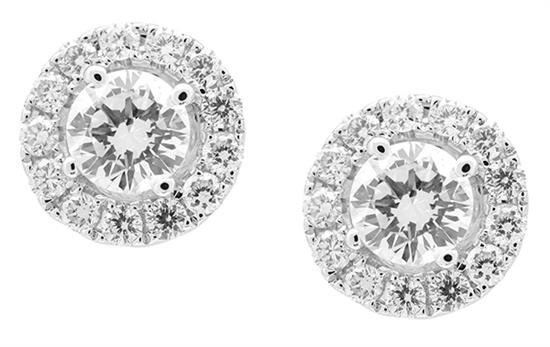 Each set with a round brilliant cut diamond of 0.50cts, surrounded by further diamonds, mounted in 18ct white gold.