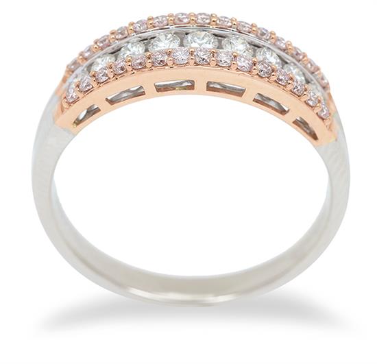 Featuring a central row of round brilliant cut white diamonds totalling 0.72cts, flanked by a row of pink diamonds totalling 0.60cts, mounted in platinum and 18ct gold, ring size Z+.