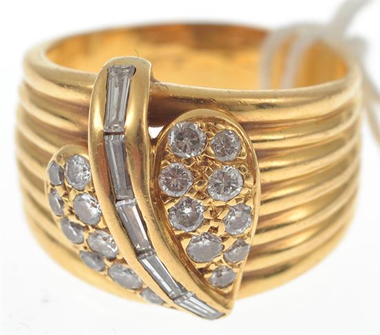 The wide fluted band with applied baguette and round brilliant cut diamond set heart, mounted in 18ct gold, ring size N.