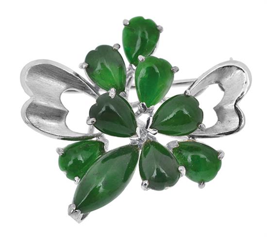 Set with nine pieces of jade cut en cabochon, mounted in 14ct white gold.