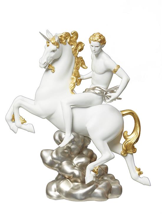 The Legend Collection culminates representing the divine love. The unicorns are magical creatures with a noble, pure and highly spiritual nature. This has helped to turn them into symbols of sanctity, virginity and power in several cultures. The god Eros, with the triumphant expression of his diamond eyes, rides the unicorn to express the power of supreme love. Eros wears his divine gold jewels and is depicted in the plenitude of his power, victorious on his mount. It is the triumph of life, of universal truth, of absolute values.