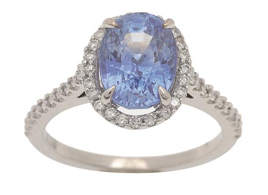 The oval cut sapphire of 3.71cts, surrounded by round brilliant cut diamonds with further set to the shoulders, mounted in 18ct white gold, ring size L-M.