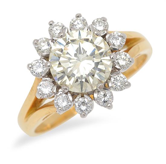 The round brilliant cut diamond of 2.60cts, surrounded by twelve further diamonds totalling 0.60cts, mounted in 18ct gold, ring size R.