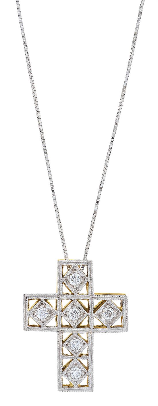 The pierced frame set with six round brilliant cut diamonds totalling 0.21cts, mounted in 18ct white and yellow gold, suspended on a trace chain of 18ct white gold.