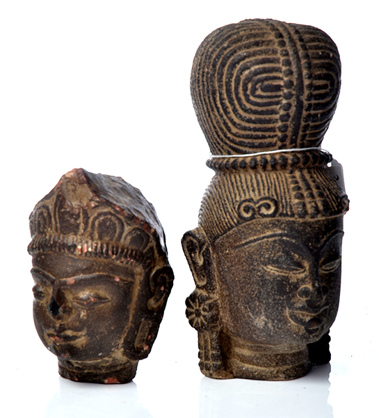 TWO STONE HEADS OF BUDDHA WITH ORNATE TOWERING HAIR BUNS