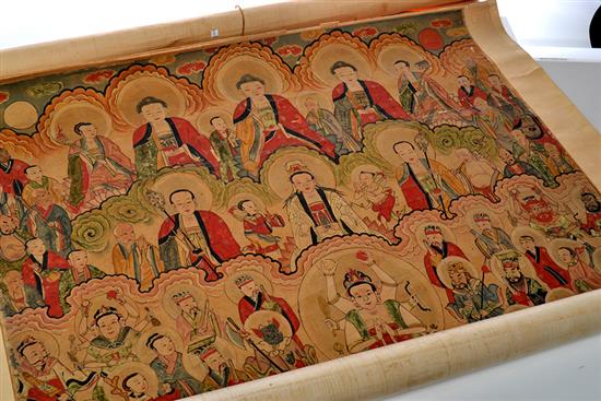 AN IMAGE OF A HUNDRED GODS. TEXT TO LEFT OF PANEL READS QIAN LONG PERIOD 1775 JIANG XI PROVENCE ARTIST XU WEN TAI. 253CM X 94 CM.