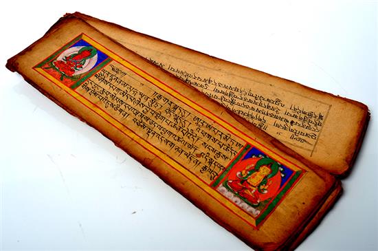 The paper album with colourful depictions of Buddha and the Sandskrit scriptures, 48cm wide.