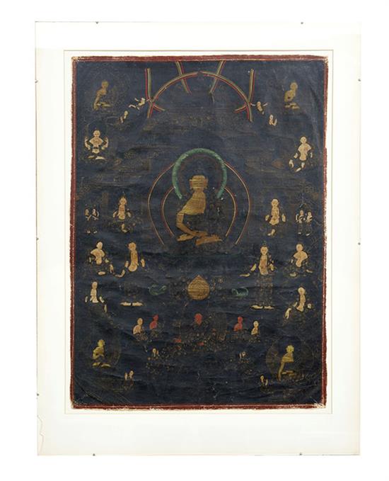 Amitabha is depicted seated on a dark background surrounded by Buddha, hand painted with mineral pigment on linen cloth, there is noticeable discolouration due to age, 62cm x 45.5cm.