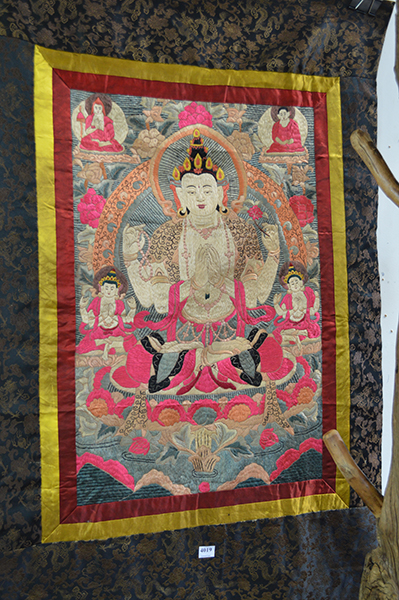 A SILK EMBROIDERED TIBETAN THANGKA DEPICTING GUANYIN. 110 CM X 64 CM.