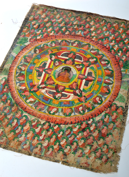 PAINTING ON CLOTH OF AN ANCESTRAL FIGURE WITH ONE HUNDRED BUDDHAS. 63 CM X 46 CM