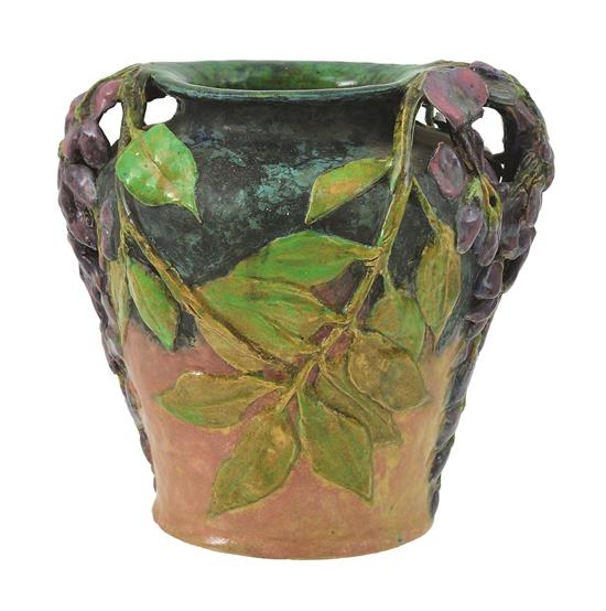 elaborate handles stylised as garlands of Hardenbergia, incised Maude Poynter RATHO 1929 to base, 16cm high, chip to one flower