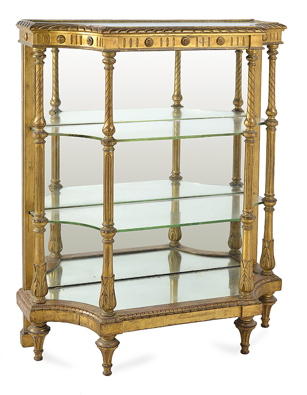 A LOUIS XVI STYLE GILTWOOD FRAMED MARBLE TOP ETAGERE
