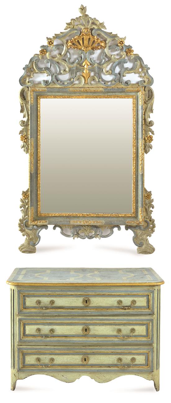 the commode 19th century with later components, comprising three drawers carved with recessed panels, the whole painted with blue-grey panels on a pale grey ground; together with a later rectangular mirror painted in a complementary colour scheme, with a foliate pierced crest and gilt highlights, the commode 120 x 81.5 x 59cm; the mirror 176.5 x 96cm
