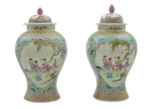 A SIMILAR PAIR OF CHINESE FAMILLE ROSE ENAMELLED VASES AND COVERS