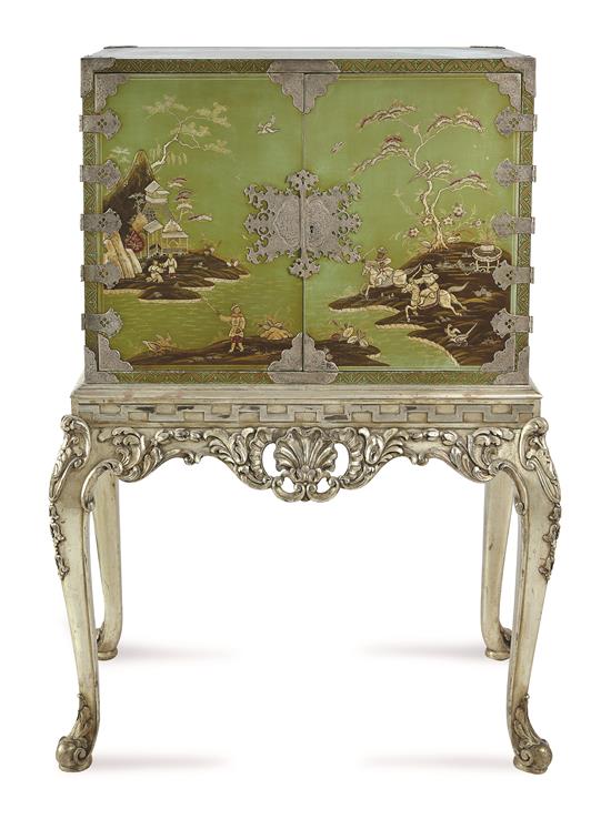 the upper section with two doors, painted sans traverse with figures in a mountainous landscape, on a pale green ground, with cast metal capped corners and mounts, raised on a separate foliate carved wooden stand with a silvered finish, the cabinet 87.5 62.5 x 48.5cm; the stand 99 x 77 x 60cm