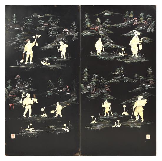 rectangular, each inlaid with scenes depicting farmers and salesmen, set against a mountainous landscape, bone signature plugs, each panel 106.5 x 61cm