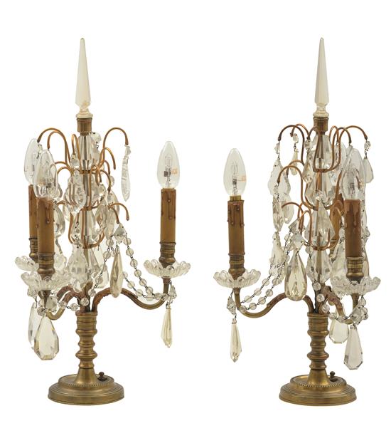 A PAIR OF FRENCH EMPIRE STYLE CRYSTAL AND BRASS TABLE CANDELABRA
