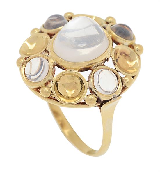 Centrally set with a star moonstone cut en cabochon, surrounded by a further four moonstones in a fancy concave setting, mounted in 18ct gold, ring size M.