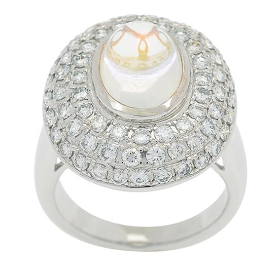 Centrally set with a moonstone cut en cabochon of 3.62cts, surrounded by three rows of small round brilliant cut diamonds totalling 1.42cts, mounted in 18ct white gold, ring size M.