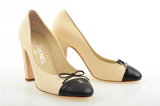 Styled in cream and black leather with silver metal Chanel monogram, labelled size 38, with box.