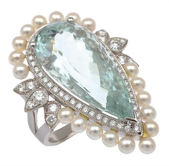Centrally set with a pear cut aquamarine of 10.85cts, surrounded by a border of round brilliant cut diamonds and an outer border of cultured pearls, mounted in 18ct white gold, ring size H-I.