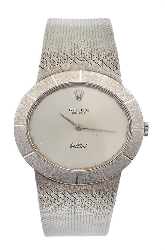 Manual wind movement, oval silvered dial, signed case dial and movement, 18ct white gold case and conforming bracelet bands with signed clasp, case number 3448372, total length 190mm, 20mm diameter.