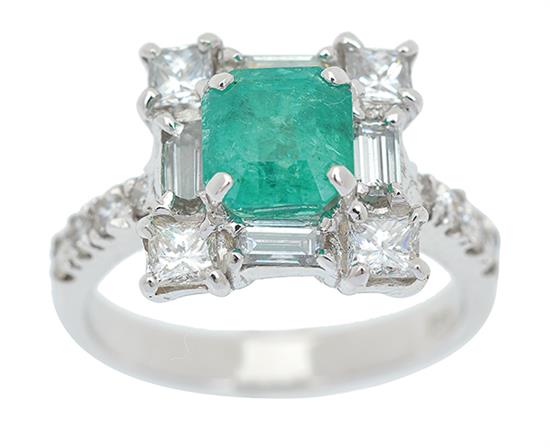 The square emerald cut emerald of 1.50cts, surrounded by baguette and princess cut diamonds with further round diamonds set to the shoulders, mounted in 18ct white gold, ring size L.