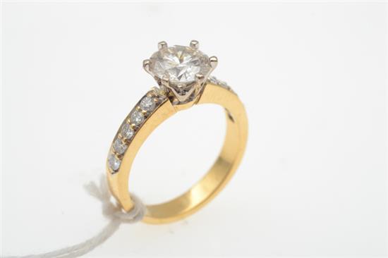 The round brilliant cut diamond of 1.55cts, having further diamonds set to the shoulders, mounted in 18ct gold, ring size L.