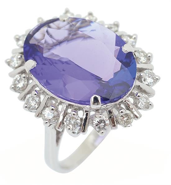 The oval cut tanzanite of 10.00cts, surrounded by sixteen round brilliant cut diamonds, mounted in 18ct white gold, ring size O.
