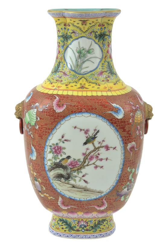 with two large oval reserve panels of birds amongst prunus and peonies, set on a coral-gilt ground, the neck with scrolling Indian lotus design set on a yellow ground, gilt 'taotie' loop handles to either side, turquoise glaze to the interior and underneath the foot of the vase, apocryphal four-character Qianlong mark to base