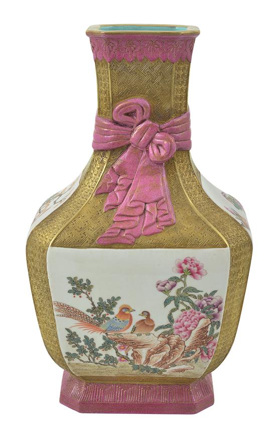 of hexagonal section, with panels of famille rose design depicting birds and flowers, set on a gilt ground incised with sections of coin and key-fret pattern, with pale ruby and gilt ground border to foot and rim, applied with a stylized pink ribbon to the neck, with turquoise glaze to the interior, gilt six-character Qianlong mark to base, 34.5cm high