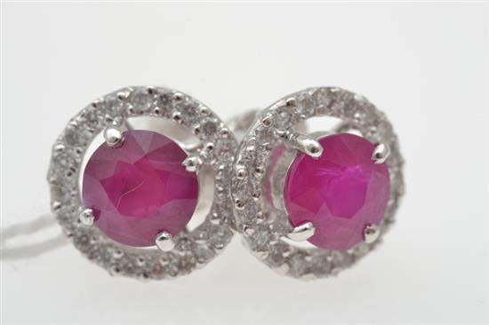 Each centrally set with a round mixed cut ruby of 1.40cts, surrounded by round brilliant cut diamonds totalling 0.30cts, mounted in 18ct white gold.