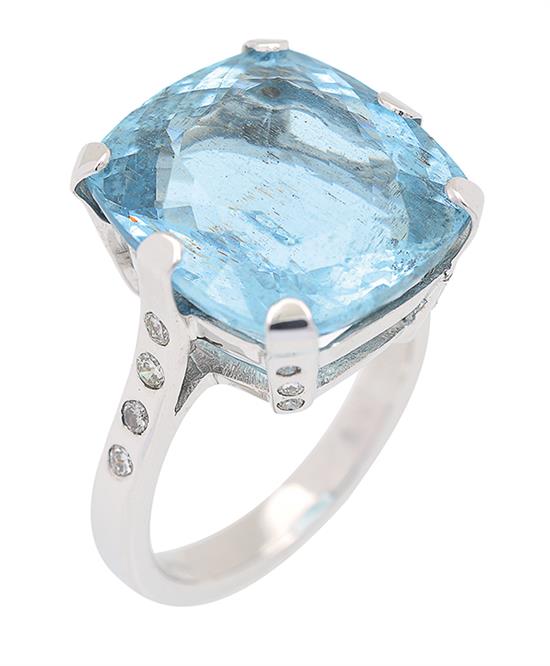 The cushion cut aquamarine of 15.10cts, having round brilliant cut diamonds set to the under bezel and shoulders, mounted in 18ct white gold, ring size P-Q.
