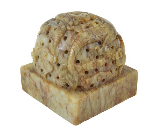 of square-section, the top in the form of a dragon ball, pierced and carved in relief with the auspicious design of a dragon amongst bats and clouds, with seal cut base, 9.3 x 9.3 x 9cm, (very minor chips to base consistent with wear)