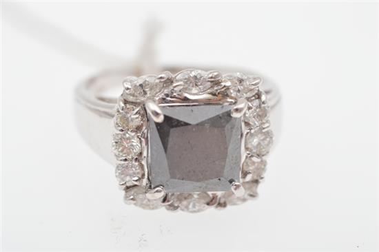 Centrally set with a square cut black diamond of 4.25cts, surrounded by marquise and round brilliant cut diamonds, mounted in 18ct white gold, ring size N.