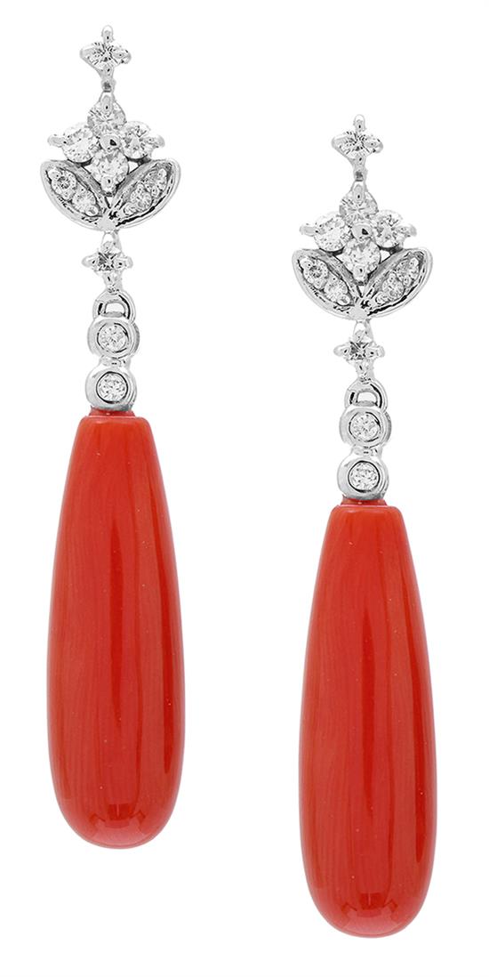 Each having a coral drop surmounted by a row and panel of round brilliant cut diamonds, mounted in 18ct white gold.
