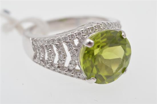 The round brilliant cut peridot of 6.00cts, to a pierced surround set with round brilliant cut diamonds, mounted in 18ct white gold, ring size L.