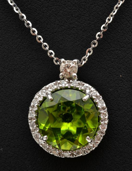 The round cut peridot of 6.81cts, surrounded by round brilliant cut diamonds, suspended from a trace chain, all mounted in 18ct white gold.