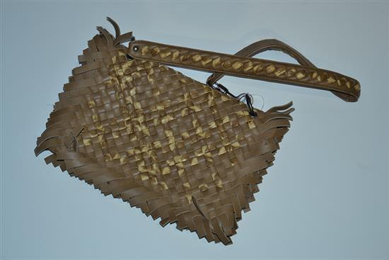 Styled in woven tan and cream leather, with silver metal hardware, 26 x 18cm.