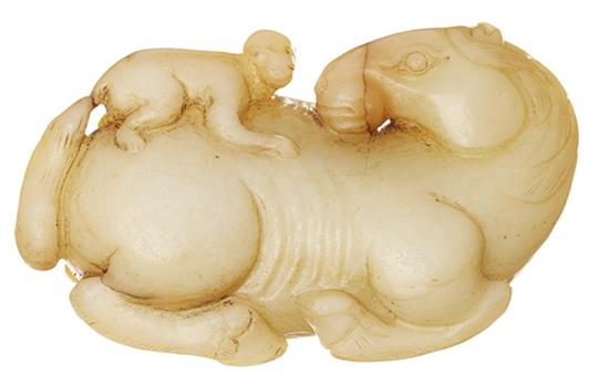 White jade carved in the round, of a recumbent horse with turned head looking at a monkey, 9.5 cm wide.