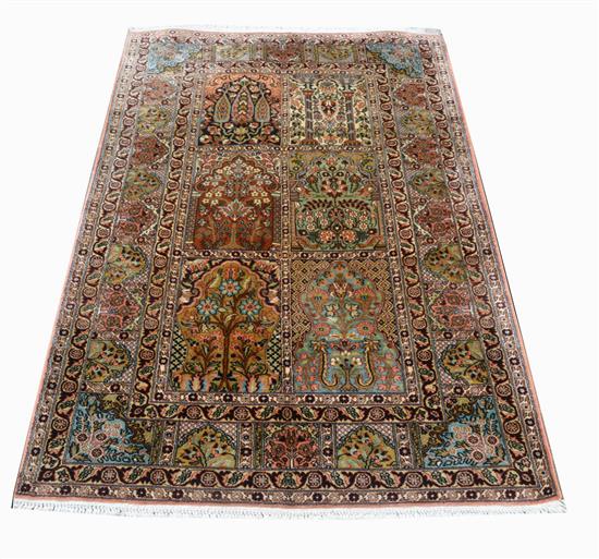 garden tile design with 6 panels featuring the tree-of-life, prayer niche (mihrabi), hanging chandelier and other floral patterns, finely wrought in a multitude of harmonious colours, with floral mihrabi pattern in small-form to the border.